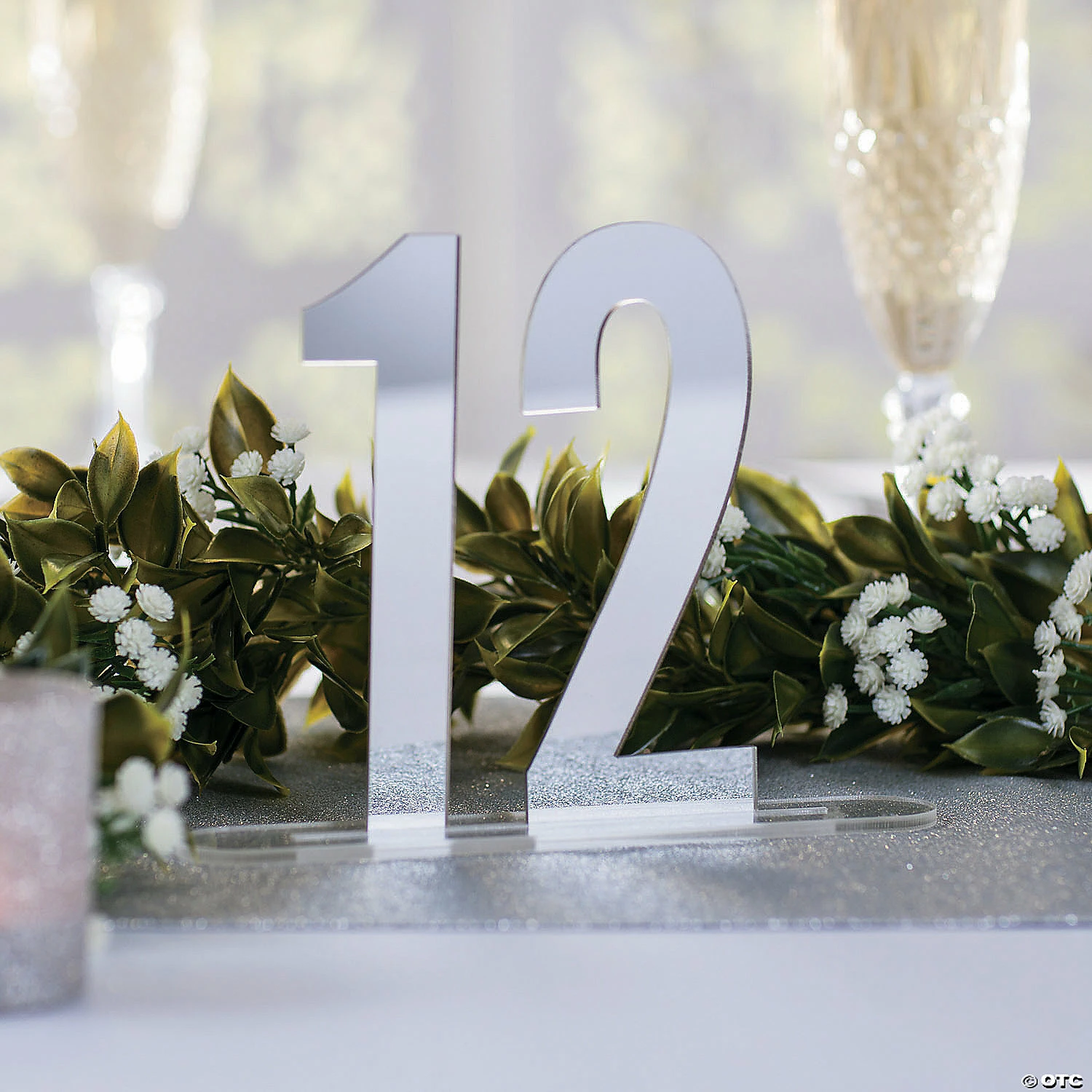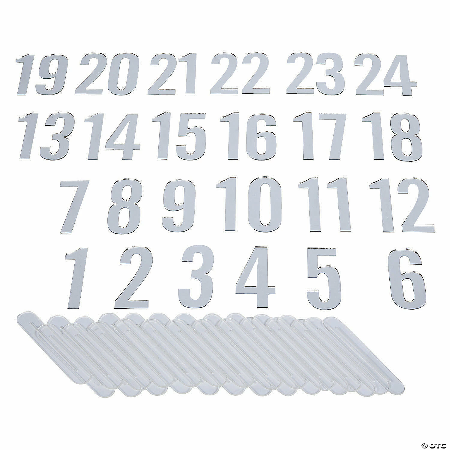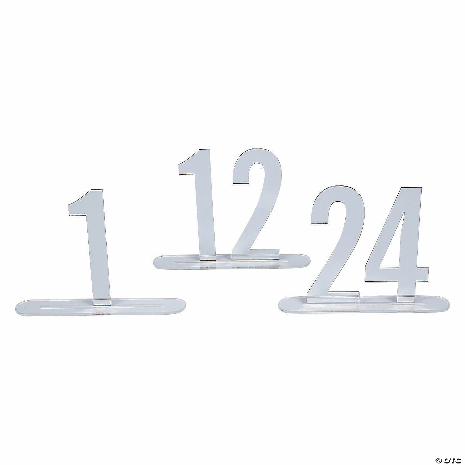 Make your dining tables really shine with these great silver mirror table numbers! A great addition to your wedding reception supplies, this set, with numbers 1 through 24, is large enough for most big events and special occasions. These table numbers can be reused and will help your guests find their seats. Includes bases. Acrylic. (24 pcs. per set) 5 1/2″ Simple assembly required. © OTC